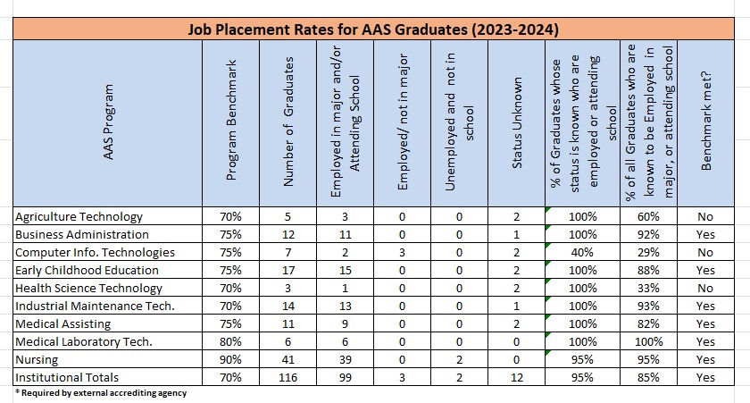 - Rationale: 70% of the institution’s AAS graduates will either be employed in a job in their chosen major or continue their education.