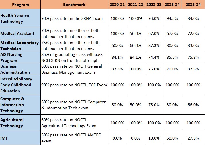 | Computer & Information Technology | 60% pass rate on NOCTI Computer & Information Tech exam | 50.0% | 50.0% | 75% | 80.0% | 66% |